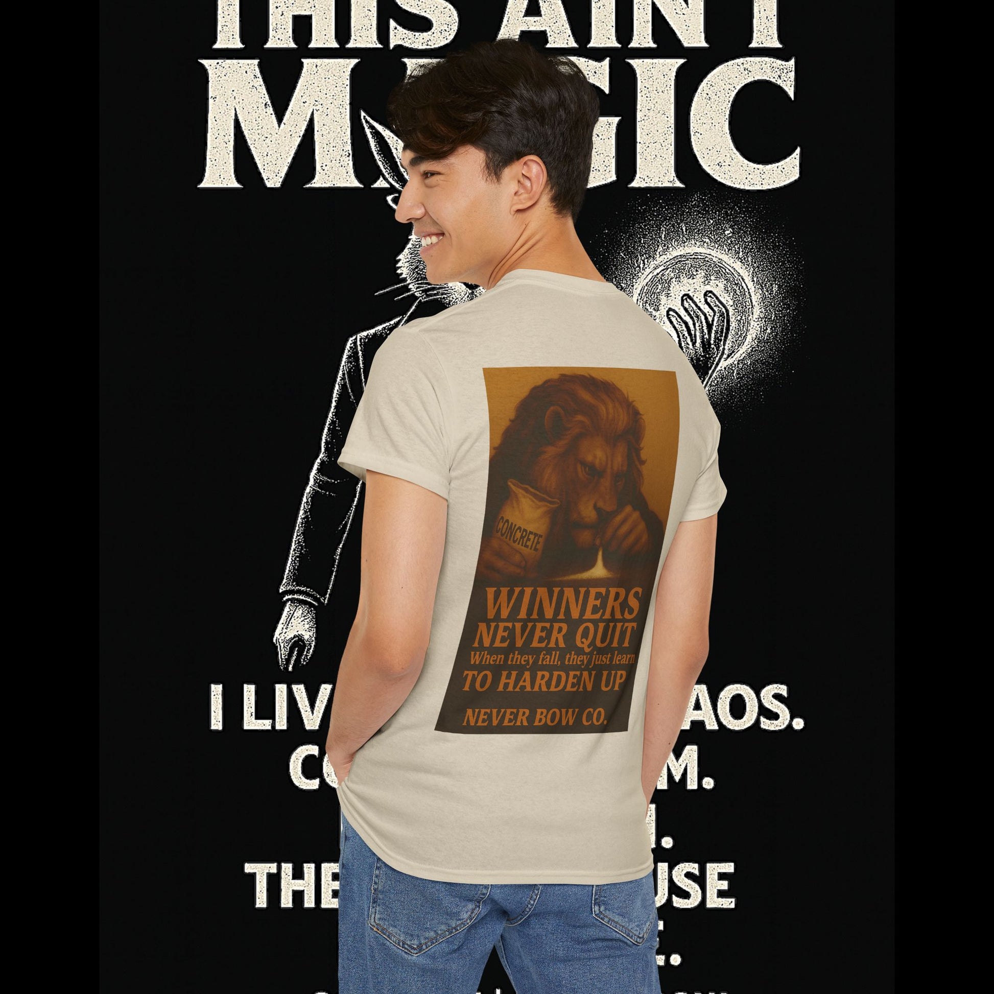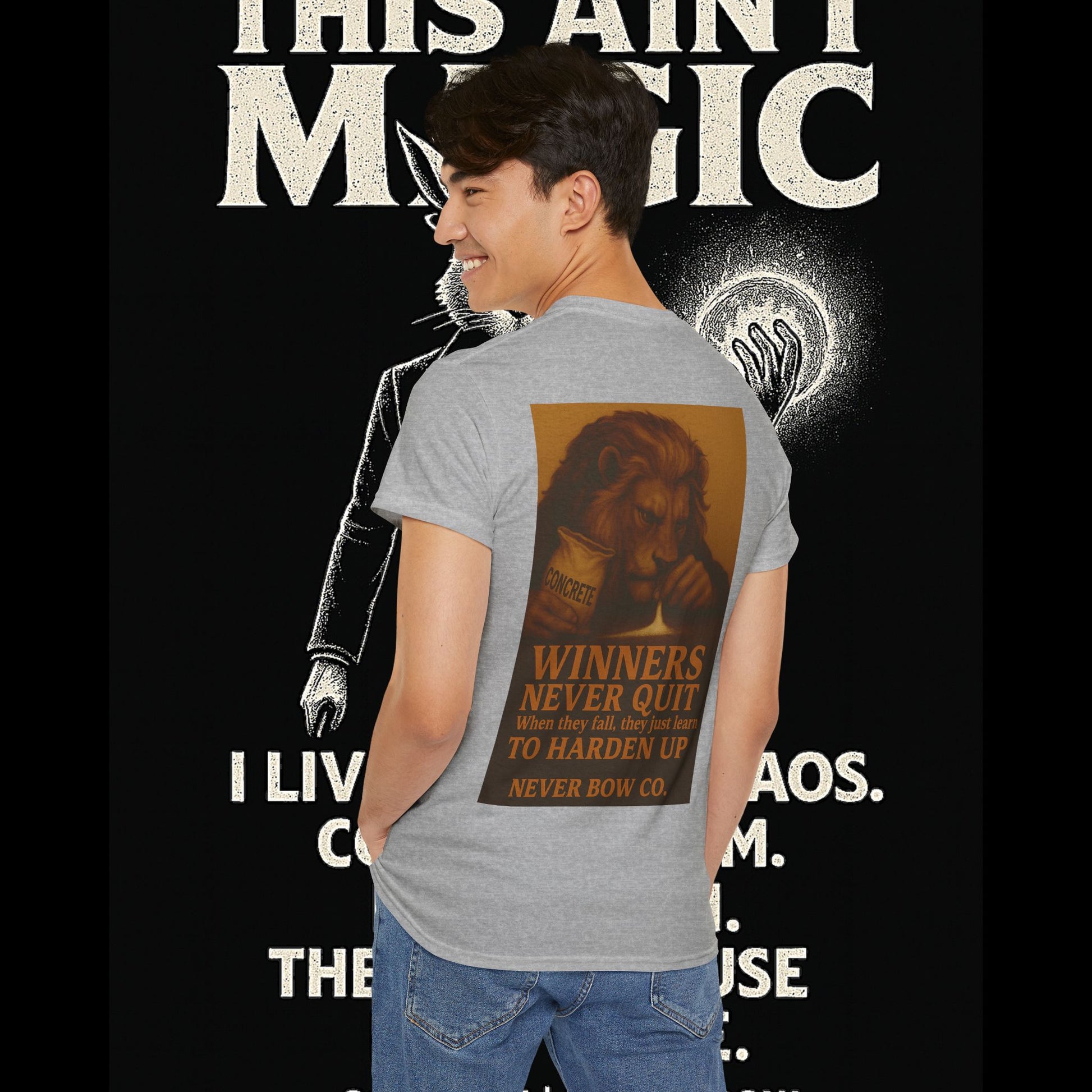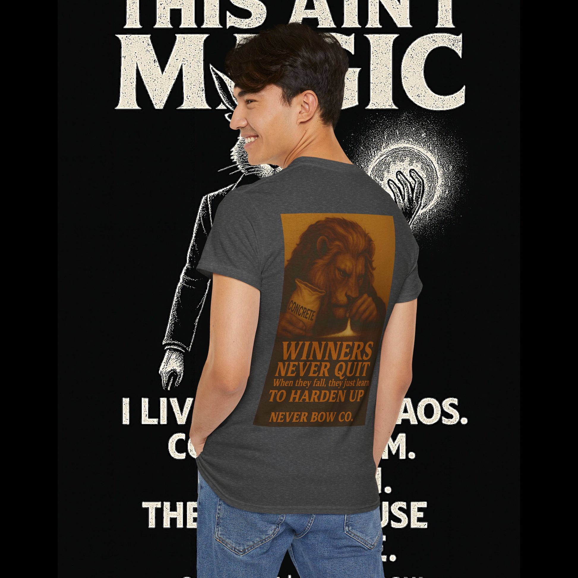 Fuel your fight with the Winners Never Quit Heavy Tee by Never Bow Co. This bold lion design reminds the world that resilience is forged in struggle — “When they fall, they just learn to harden up.”