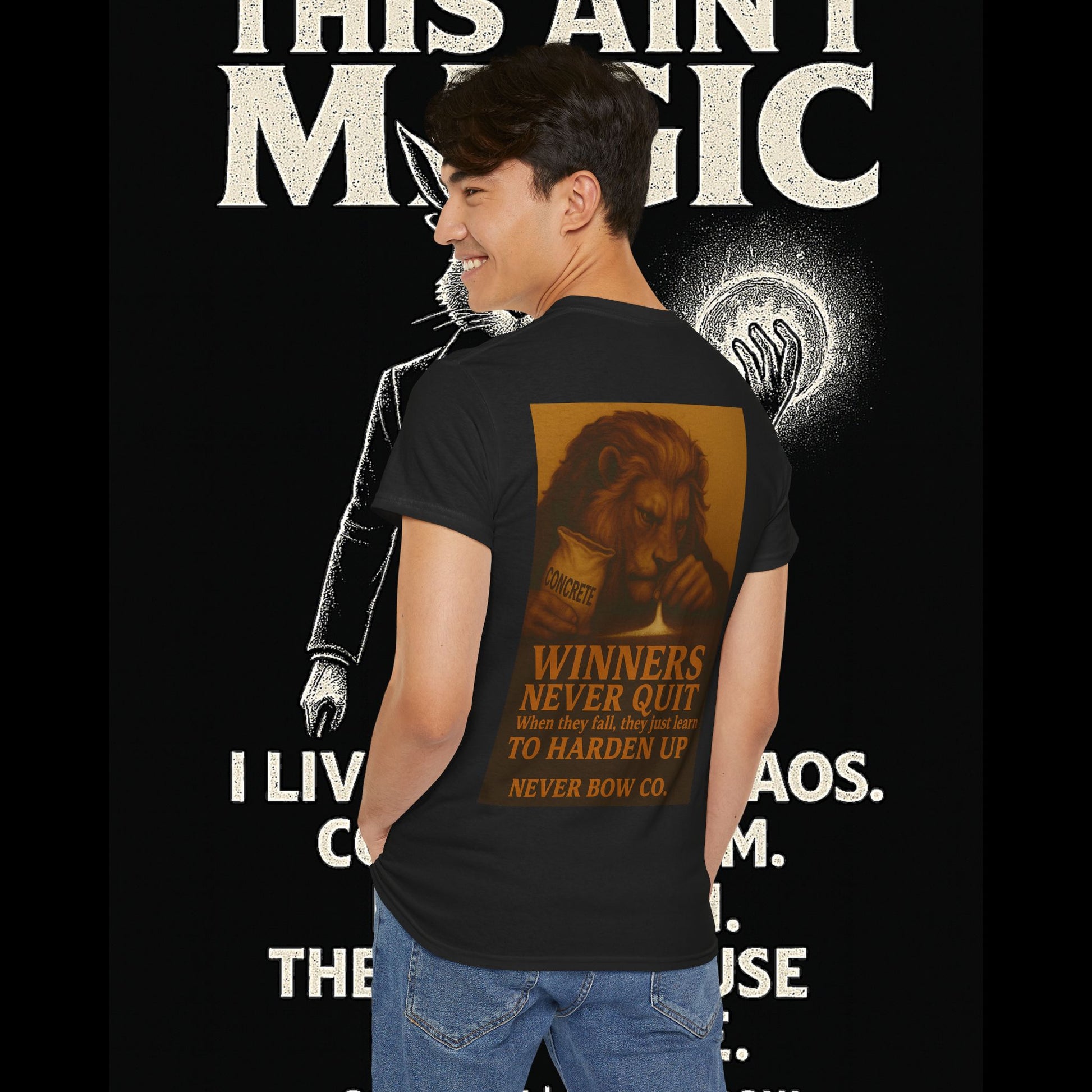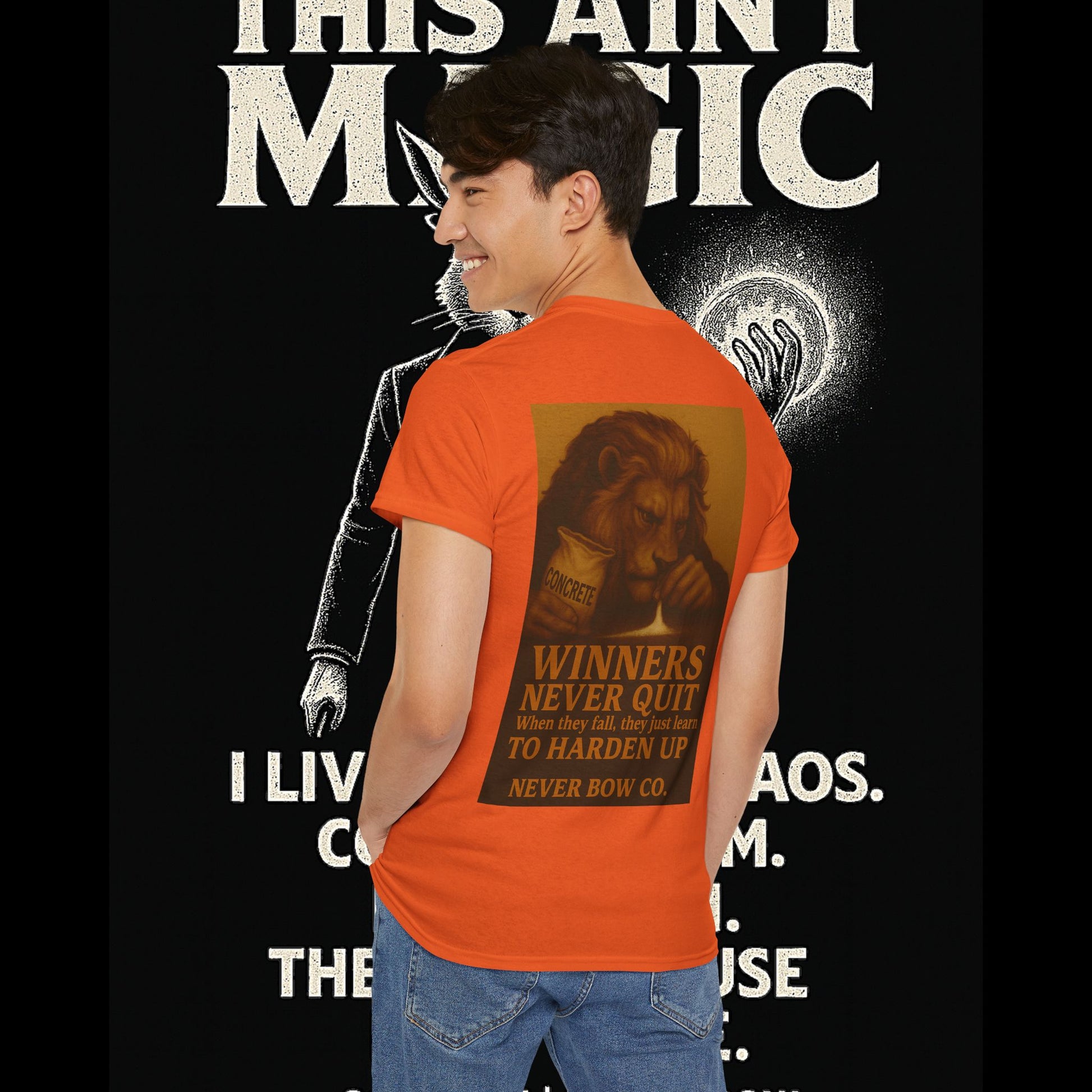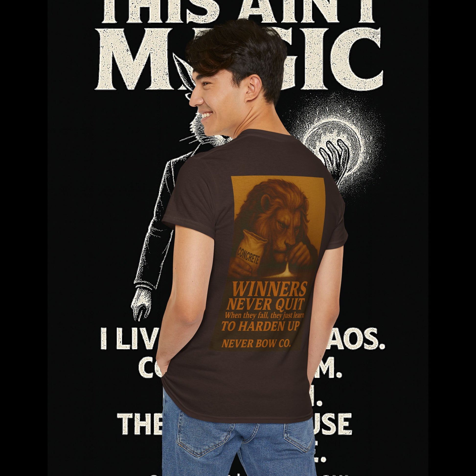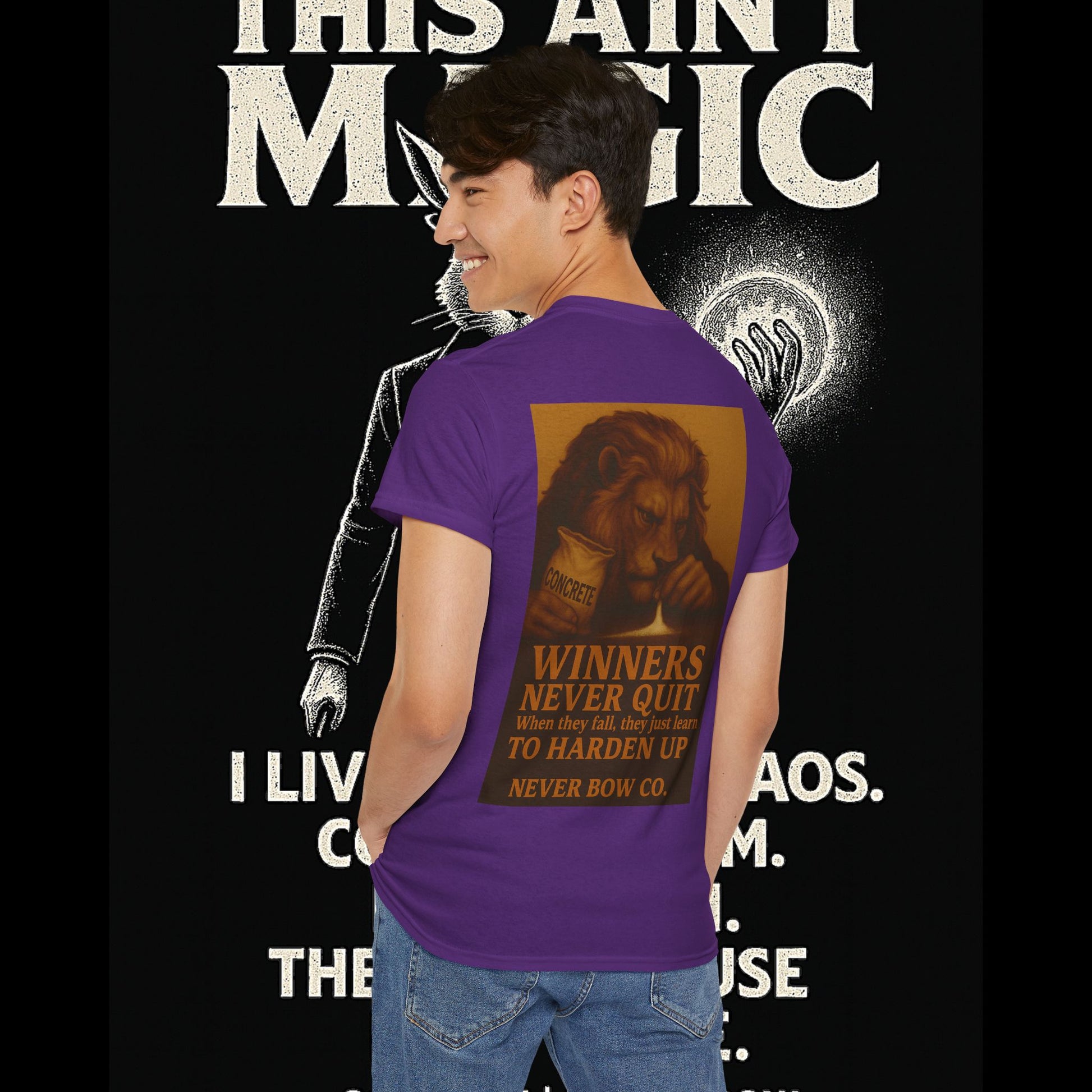 Fuel your fight with the Winners Never Quit Heavy Tee by Never Bow Co. This bold lion design reminds the world that resilience is forged in struggle — “When they fall, they just learn to harden up.”