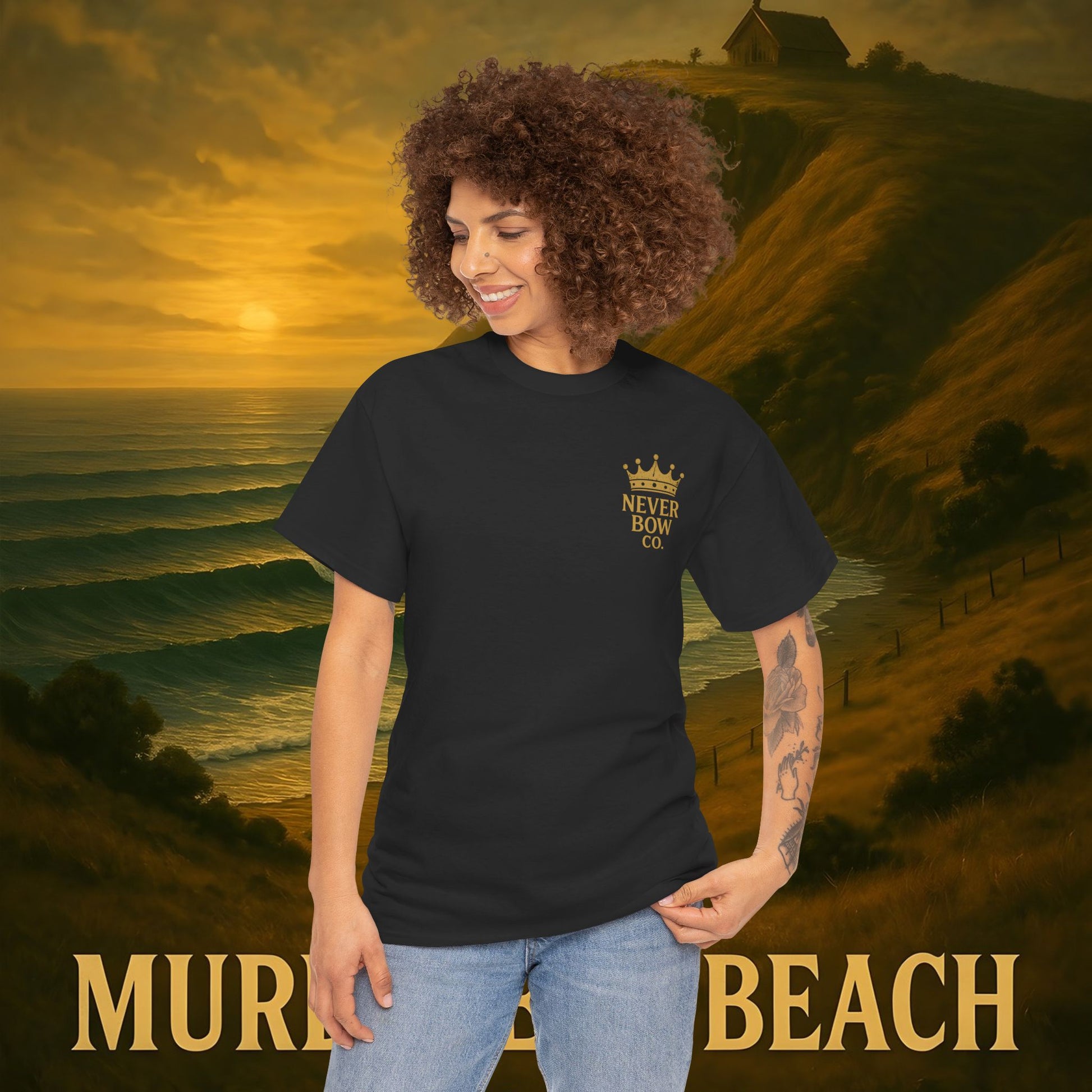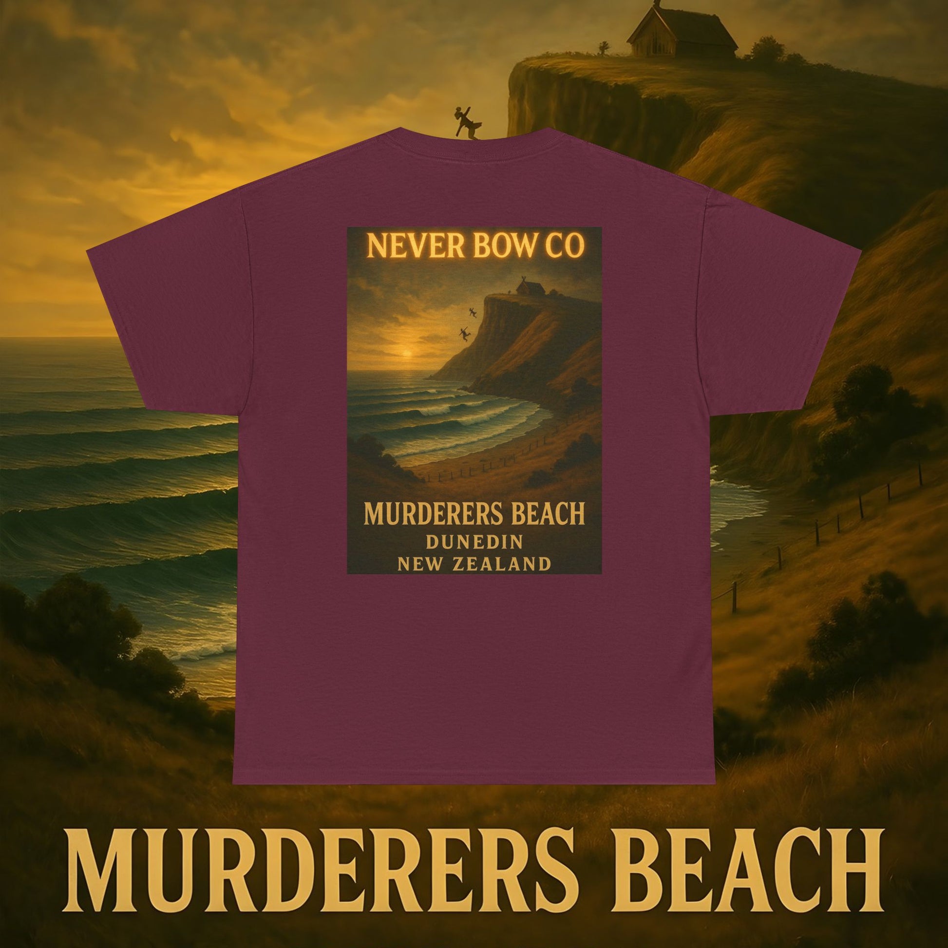 (Heavy Tee) Never Bow Co. “Murderers Beach” | Tribute to New Zealand’s Murderers Beach — a place of history, spirit, and defiance. Heavy cotton tee built for rebels, truth seekers, and ocean warriors. Wear the legend. Never Bow.