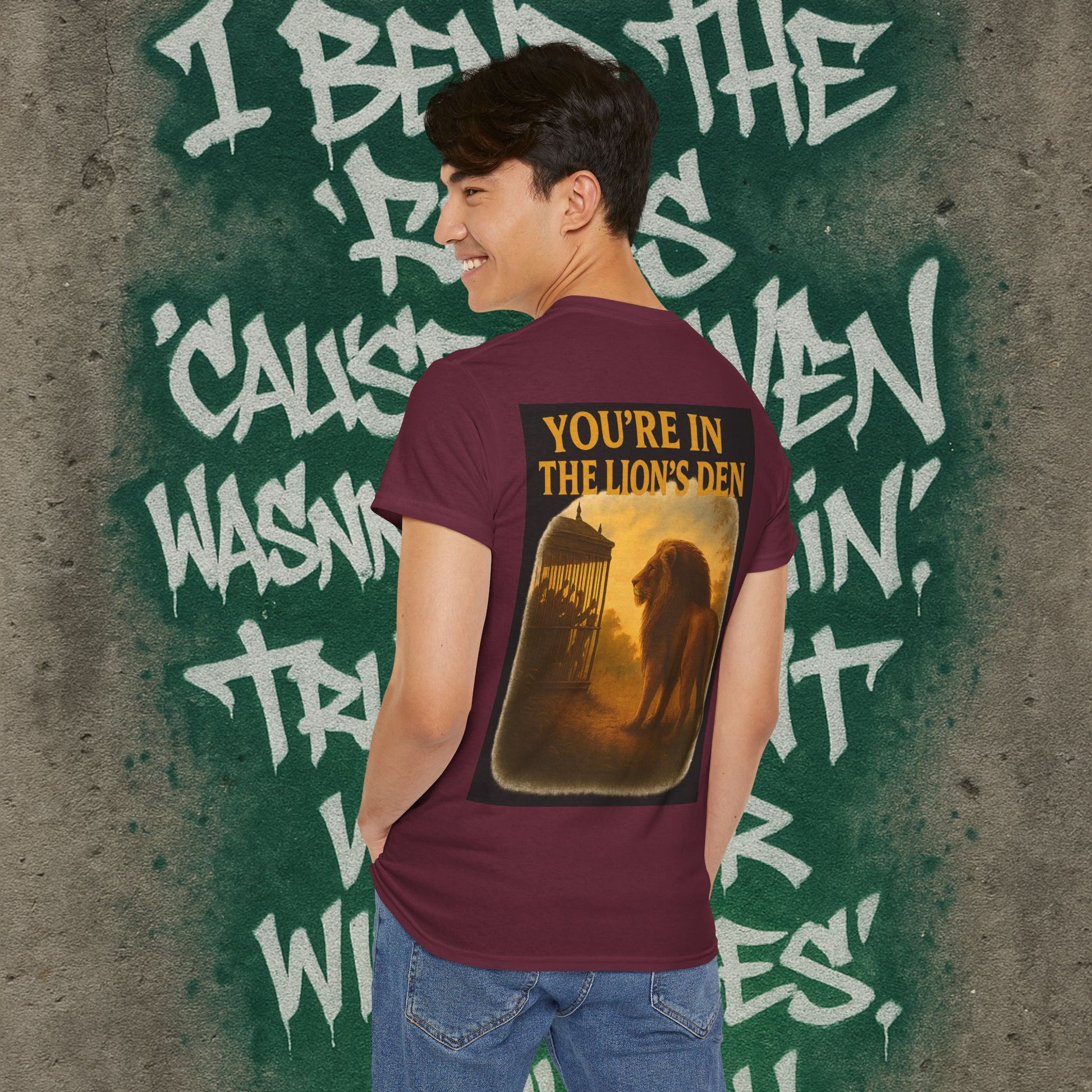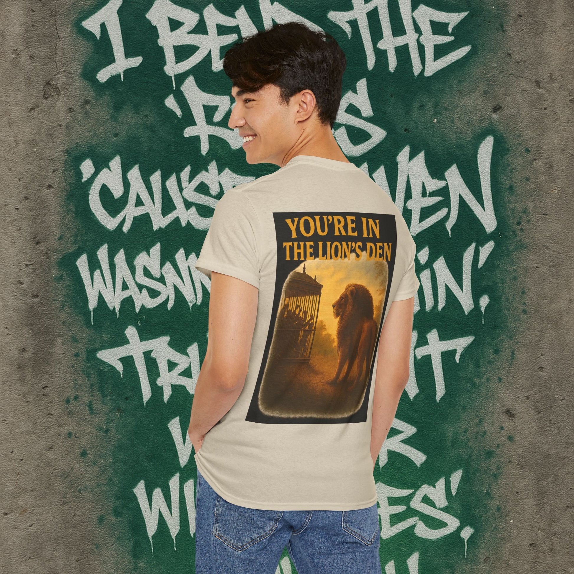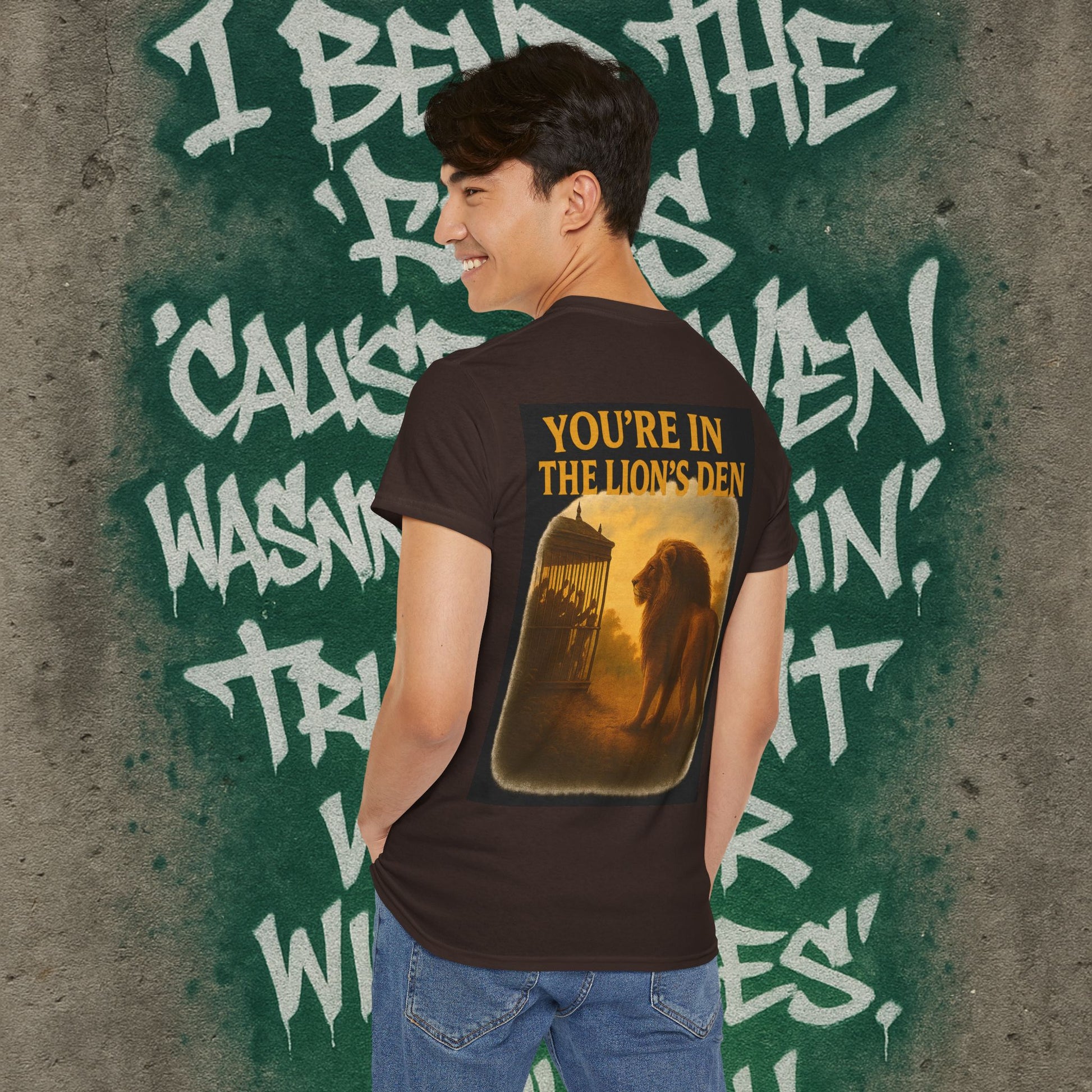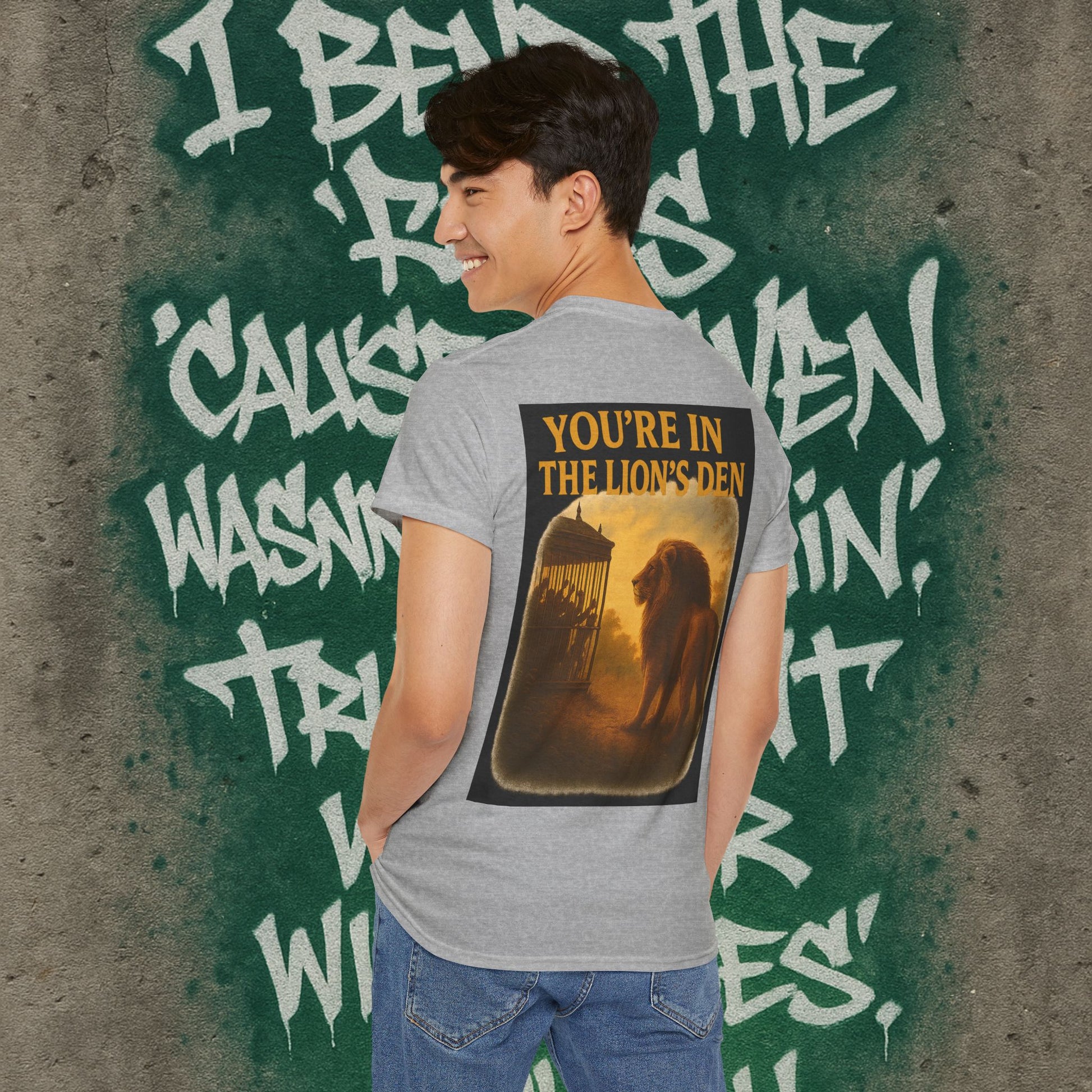 (Heavy Tee) Never Bow Co “You’re in the Lion’s Den” Graphic Streetwear Tee | Step into the Lion’s Den. Fearless statement piece built for warriors who refuse silence. Heavy cotton, bold graphic, courtroom grit. Wear strength, fight truth, and Never Bow.