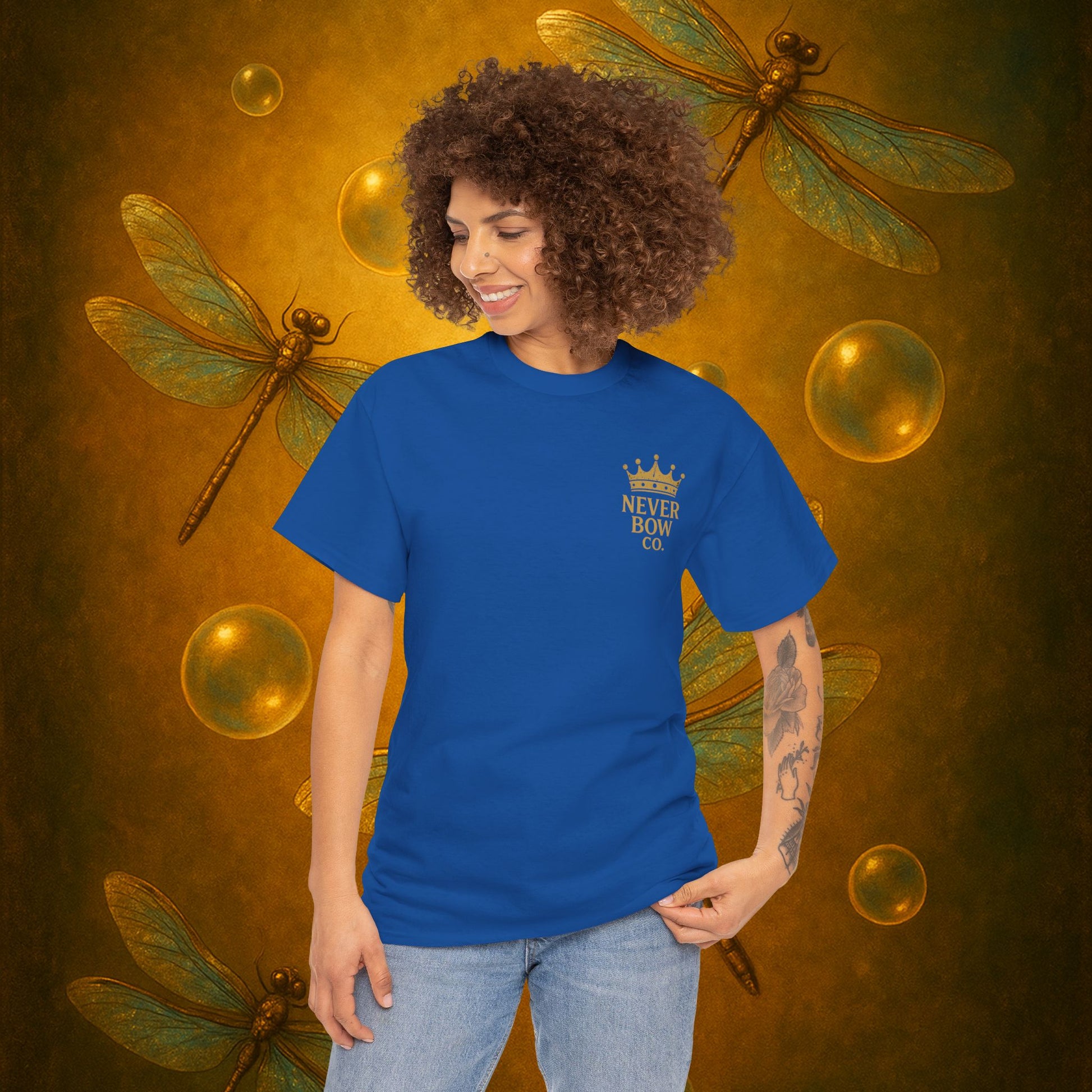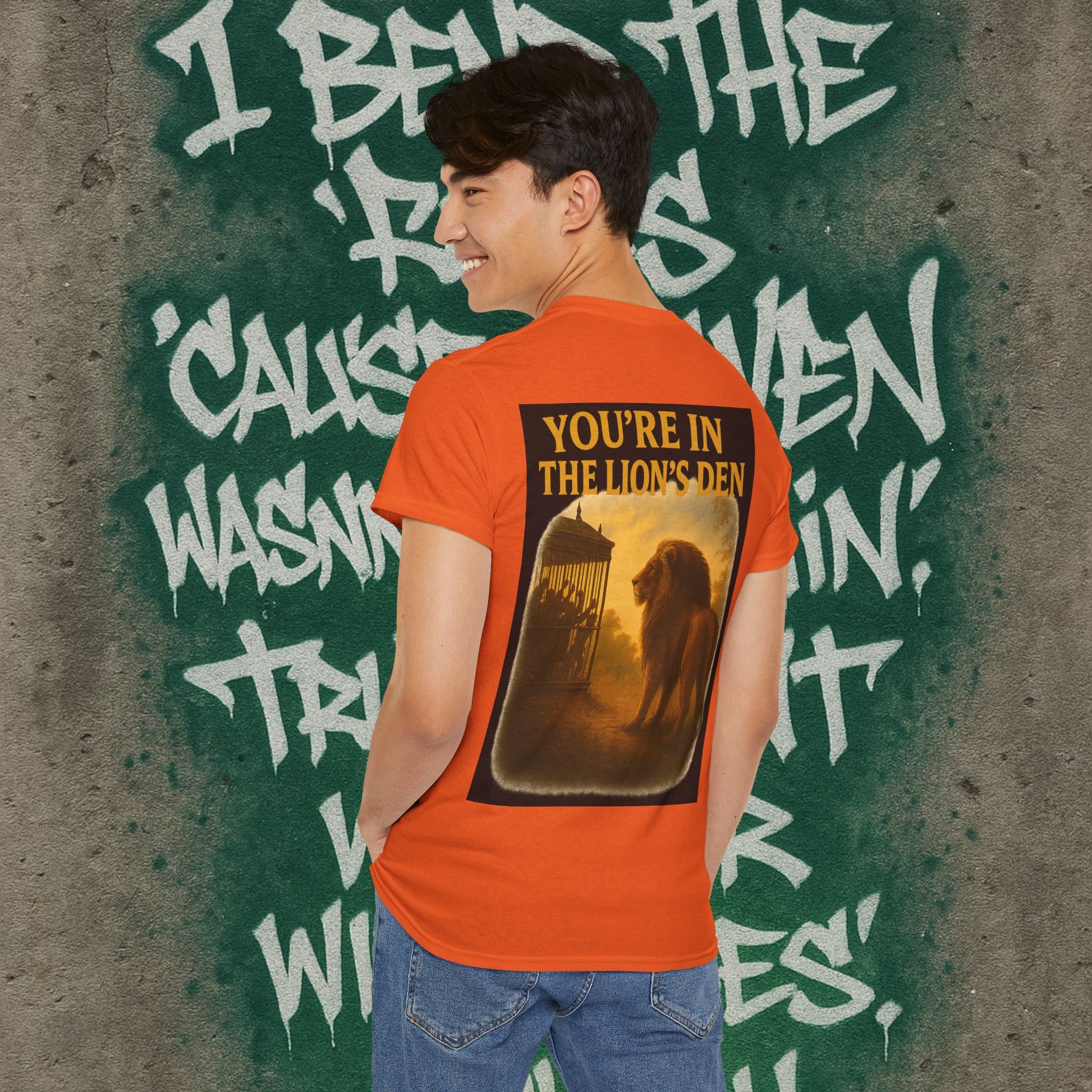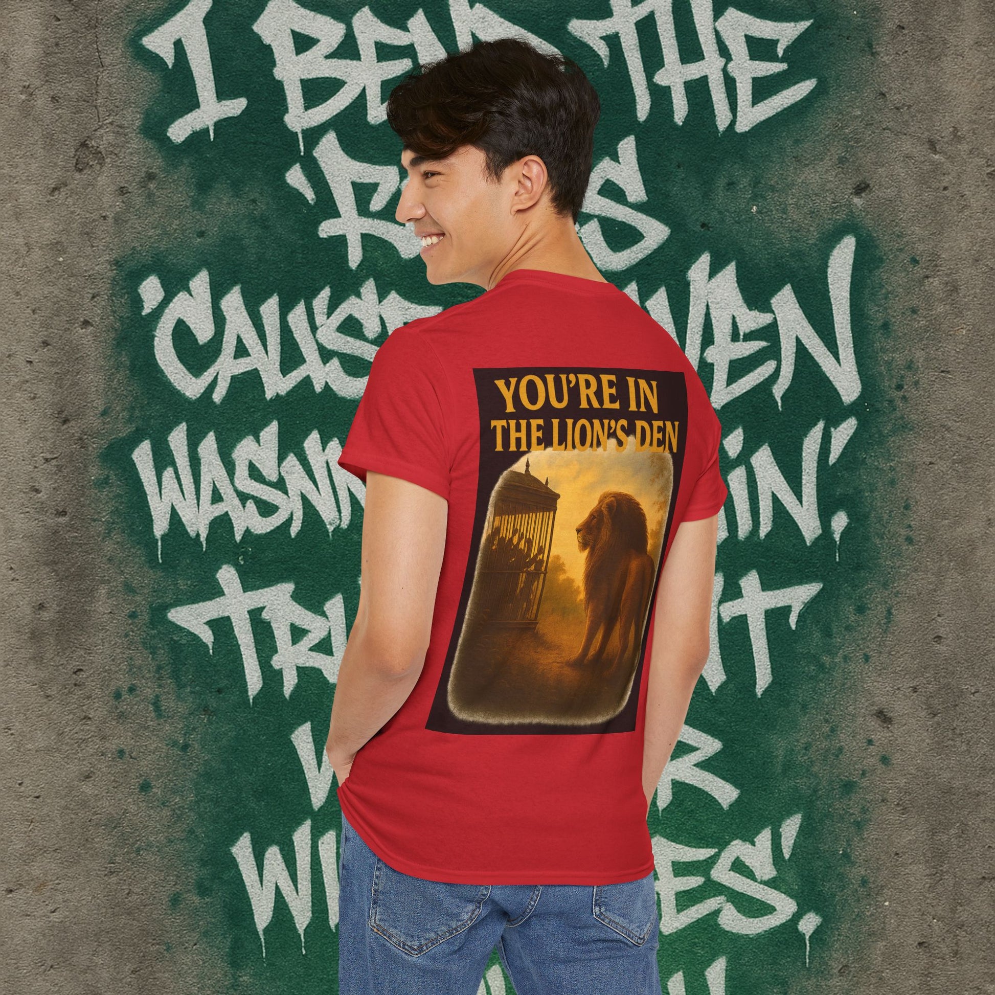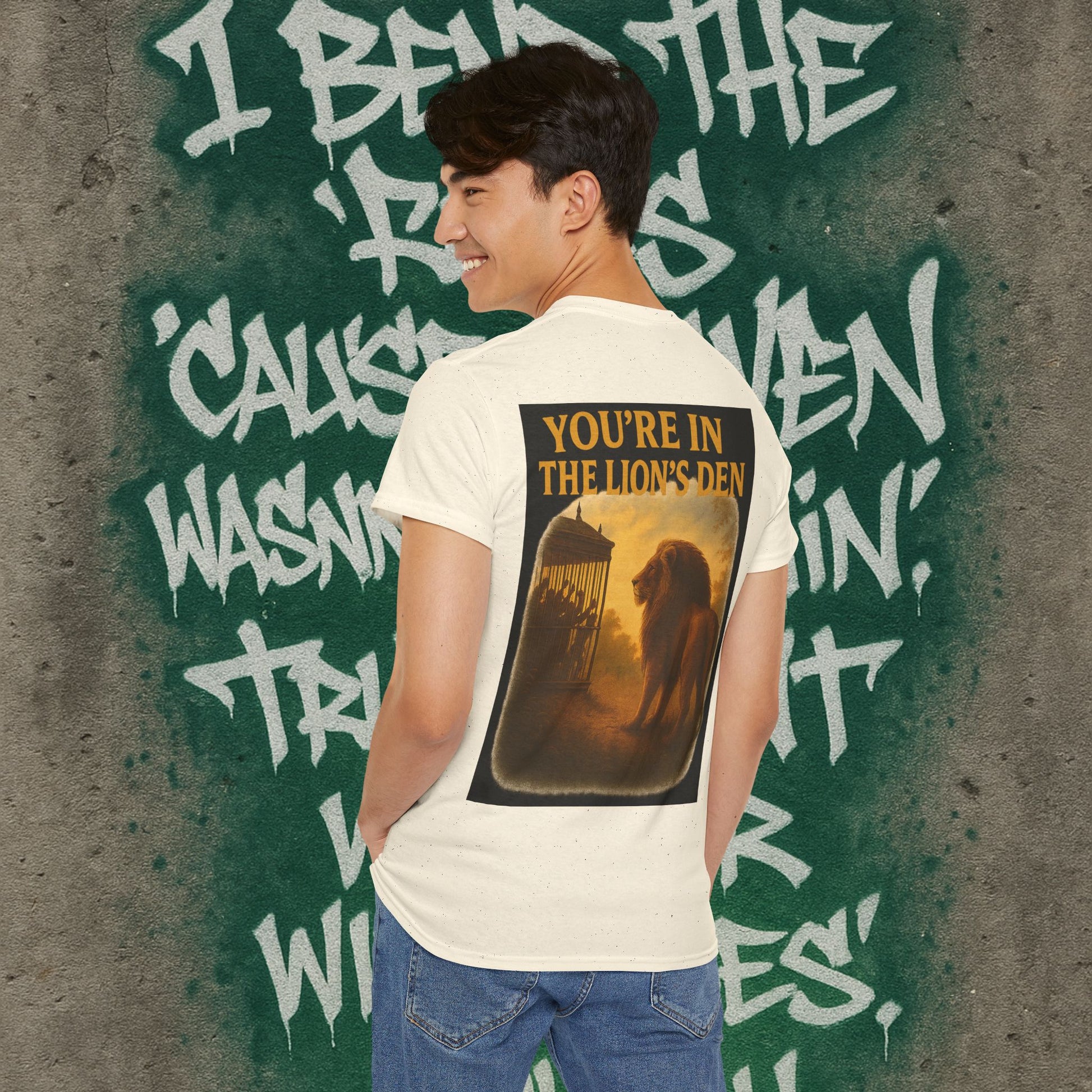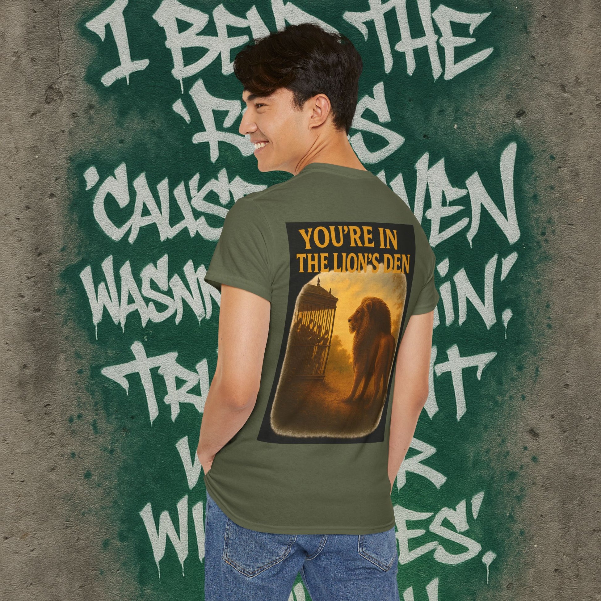 (Heavy Tee) Never Bow Co “You’re in the Lion’s Den” Graphic Streetwear Tee | Step into the Lion’s Den. Fearless statement piece built for warriors who refuse silence. Heavy cotton, bold graphic, courtroom grit. Wear strength, fight truth, and Never Bow.