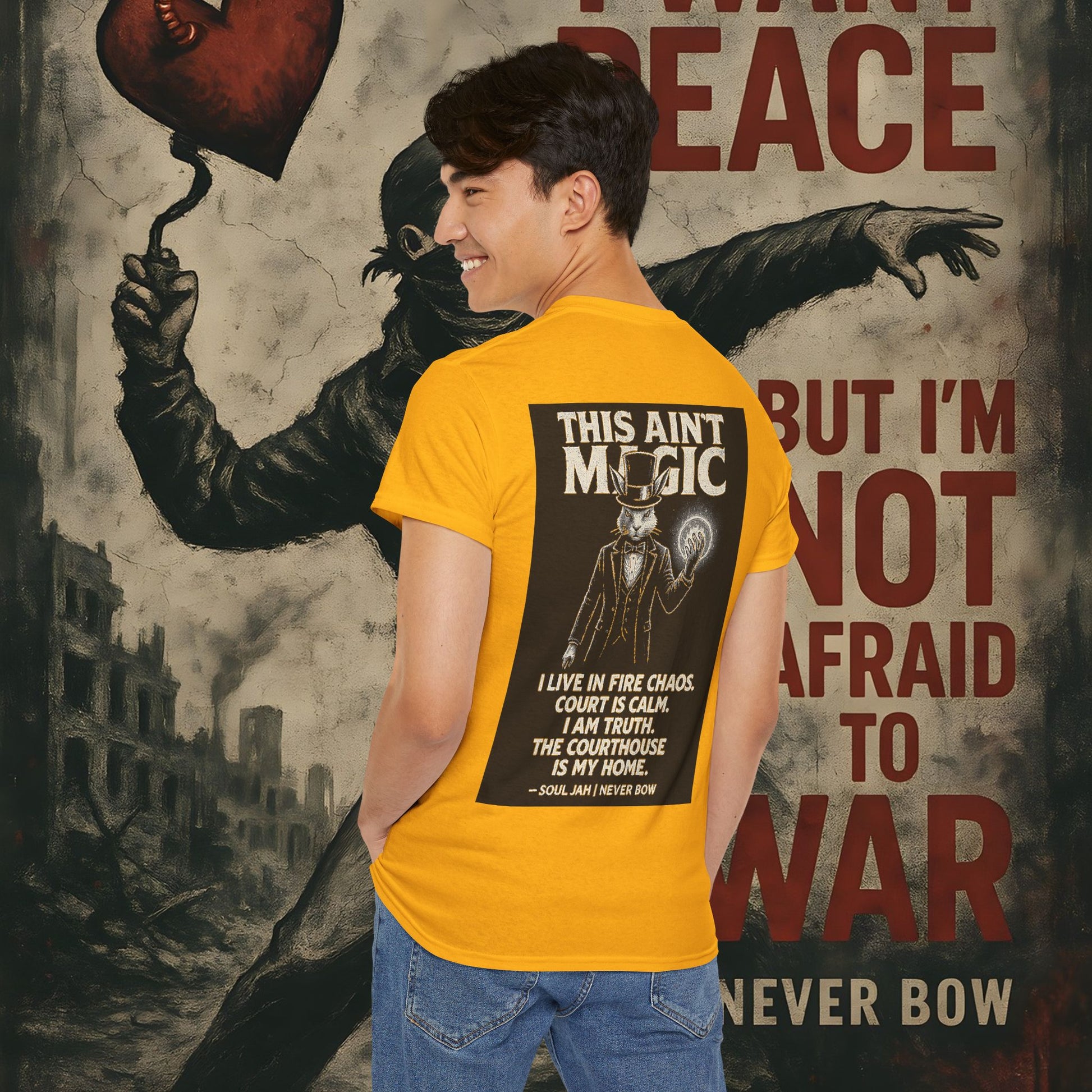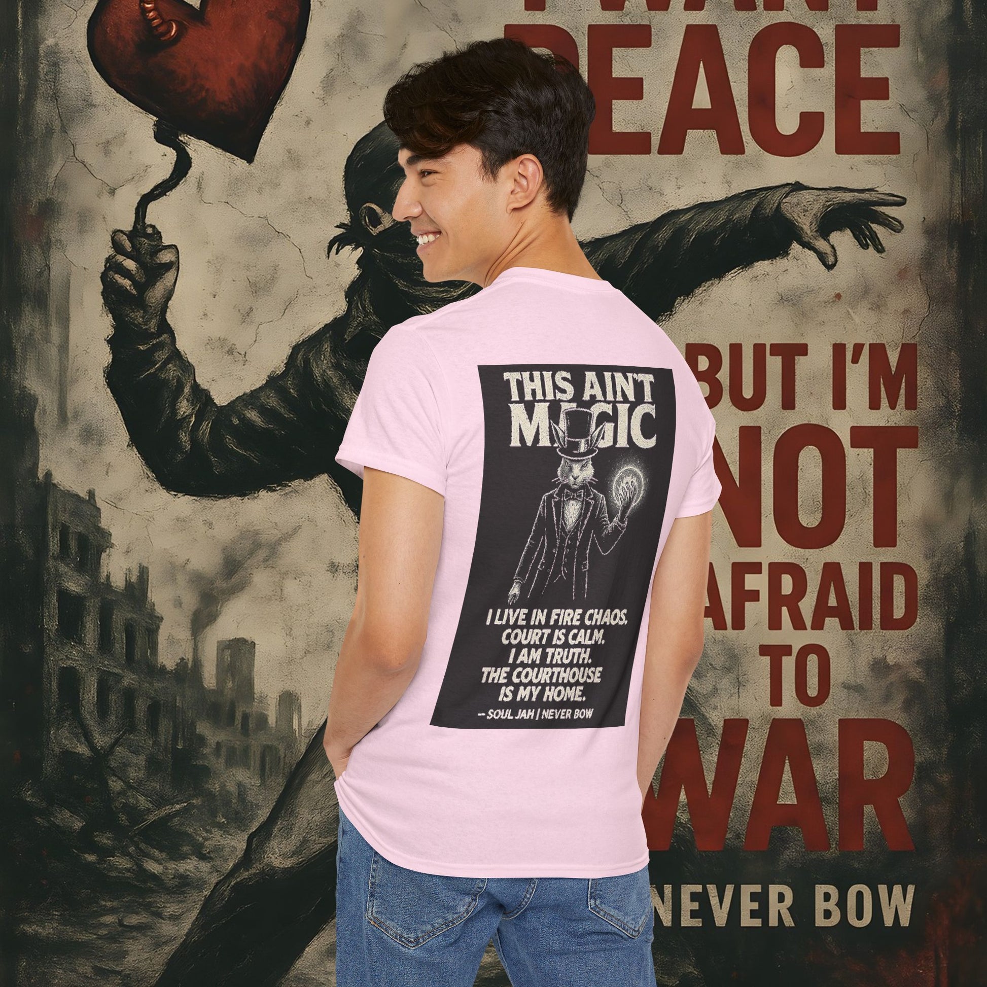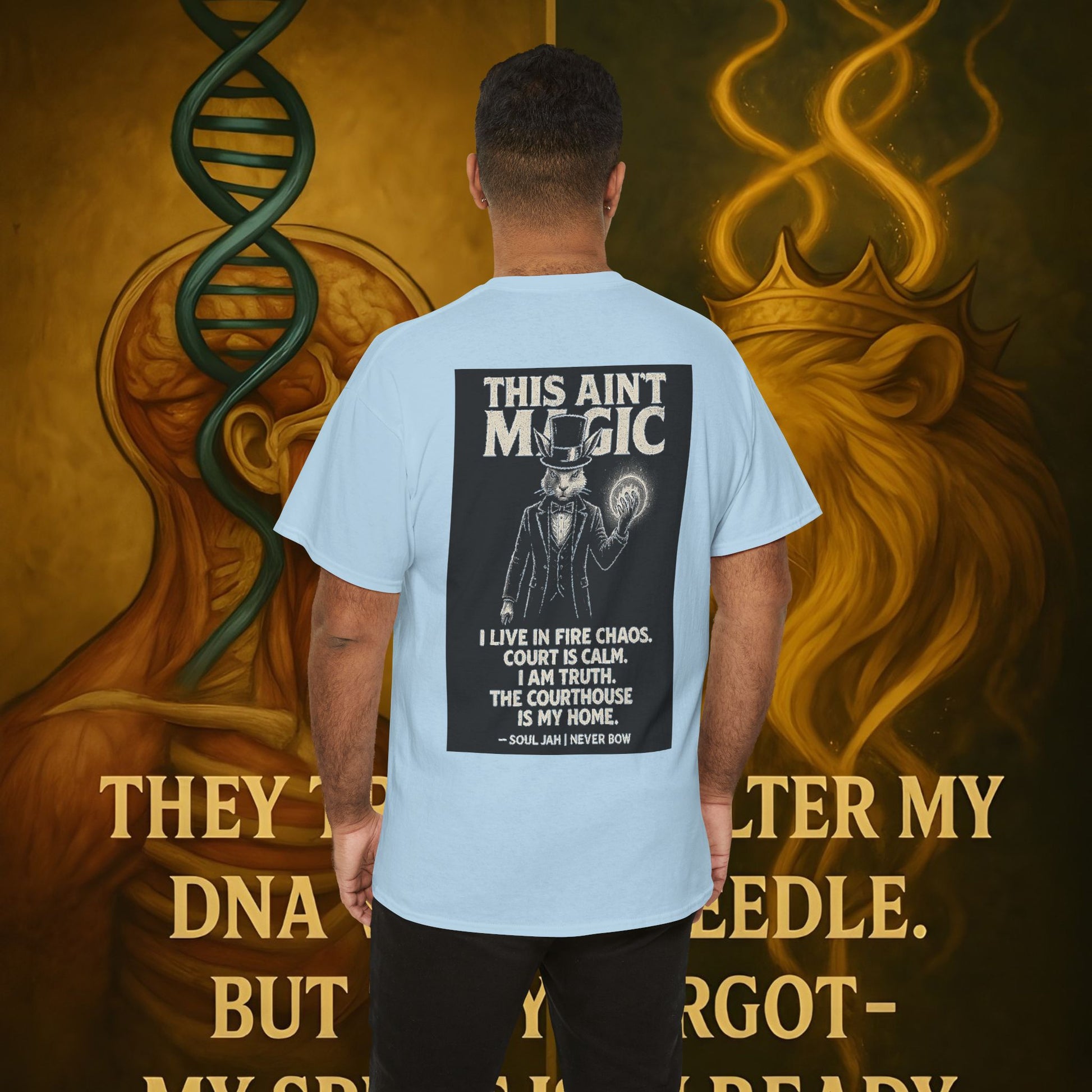 (Heavy Tee) This Ain’t Magic Tee | Chaos is loud. Court is calm. “This Ain’t Magic” lays it bare: truth stands taller than illusions. Heavy cotton built for warriors who carry fire inside but never bow.